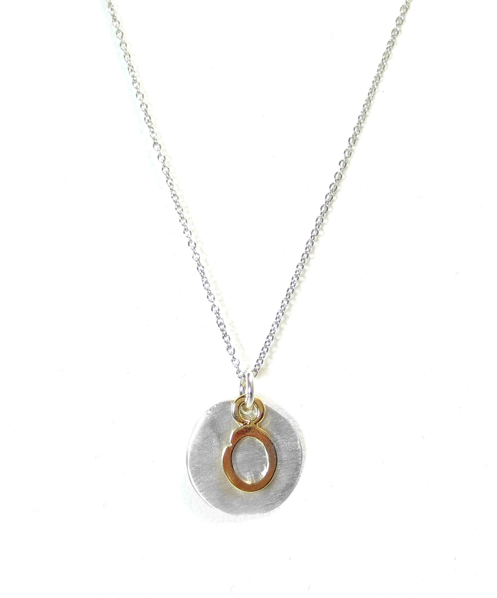 Pretty mini pendant monogram necklace! Silver plated disk behind a 14k gold plated petite initial or symbol. 1/2 inch diameter disk. 18 inch chain, no extender.