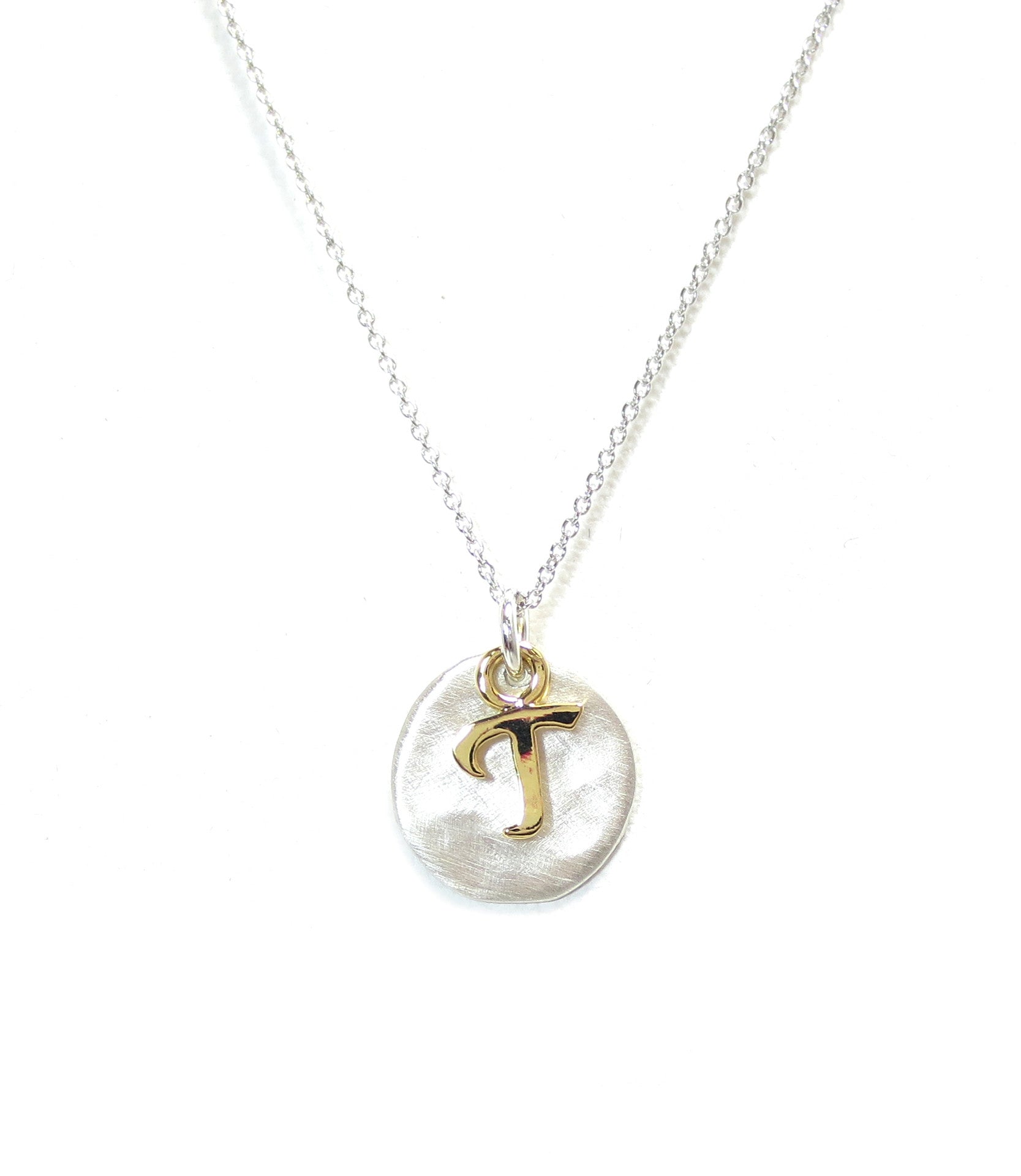 Pretty mini pendant monogram necklace! Silver plated disk behind a 14k gold plated petite initial or symbol. 1/2 inch diameter disk. 18 inch chain, no extender.